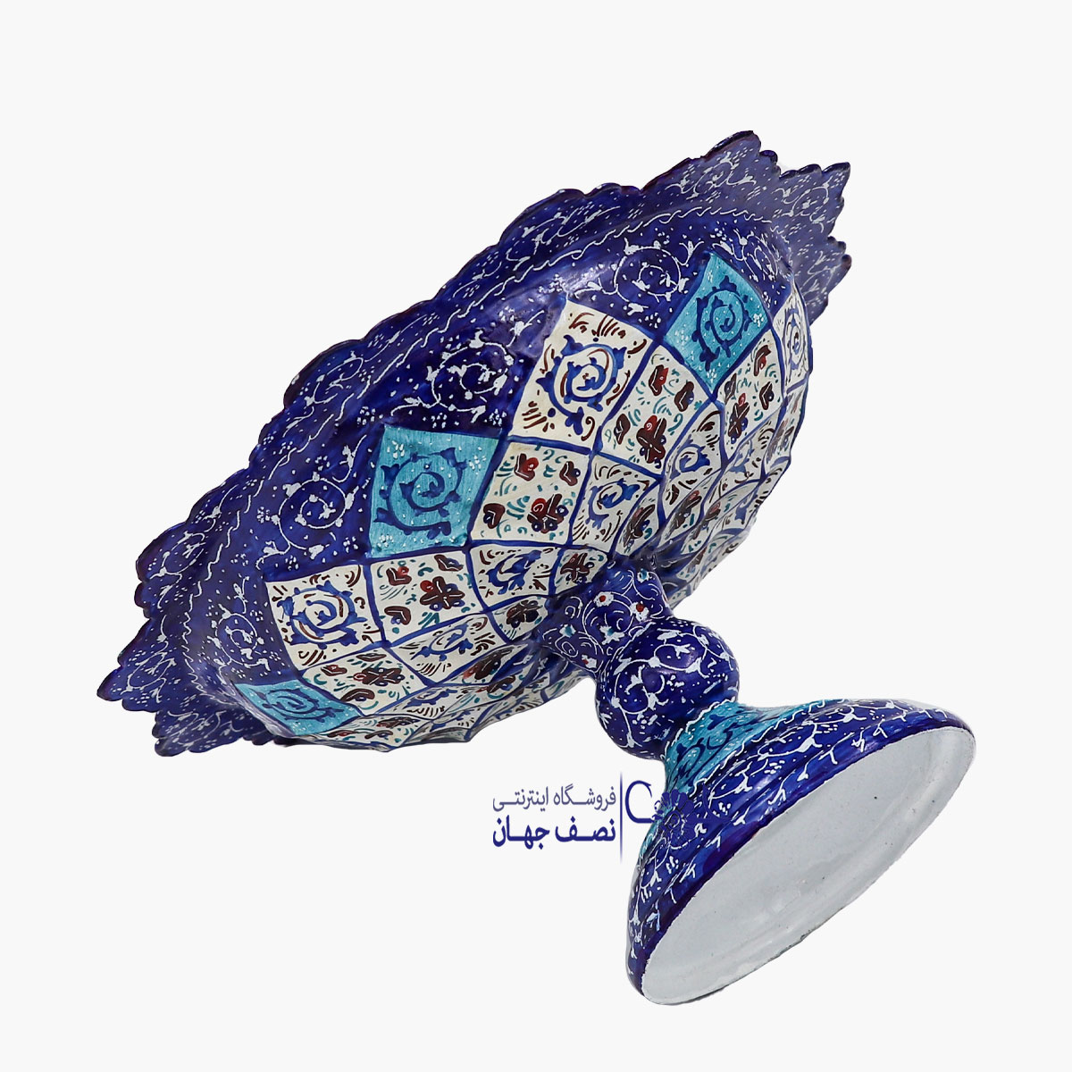 کاسه بشقاب مینا کاری کد MK20 قطعه فلزی است به صورت ظرفی درآمده لعاب خورده و روی آن نقاشی اسلیمی و قطعاتی به صورت پیچ و گره و گل کشیده شده و بعد پخته میشود .