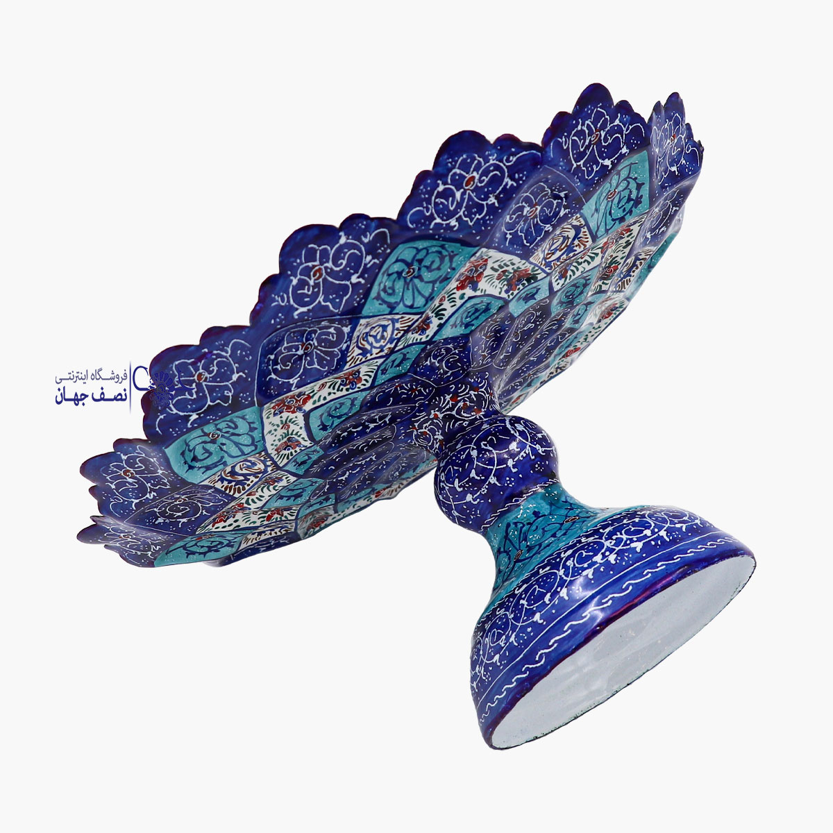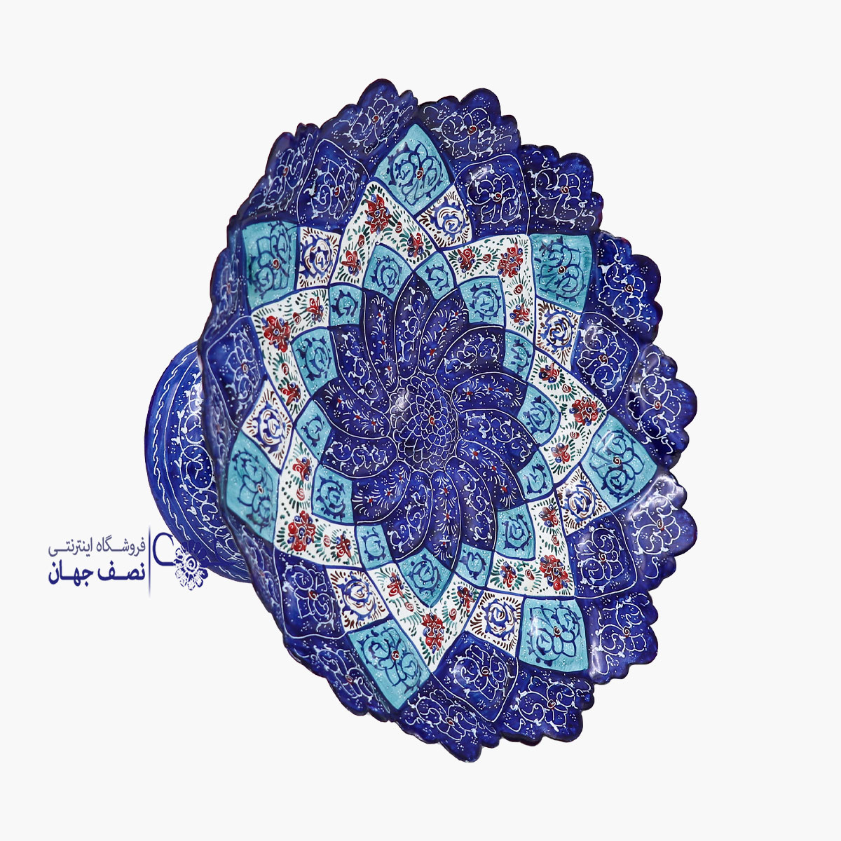 کاسه بشقاب مینا کاری کد MK20 قطعه فلزی است به صورت ظرفی درآمده لعاب خورده و روی آن نقاشی اسلیمی و قطعاتی به صورت پیچ و گره و گل کشیده شده و بعد پخته میشود .